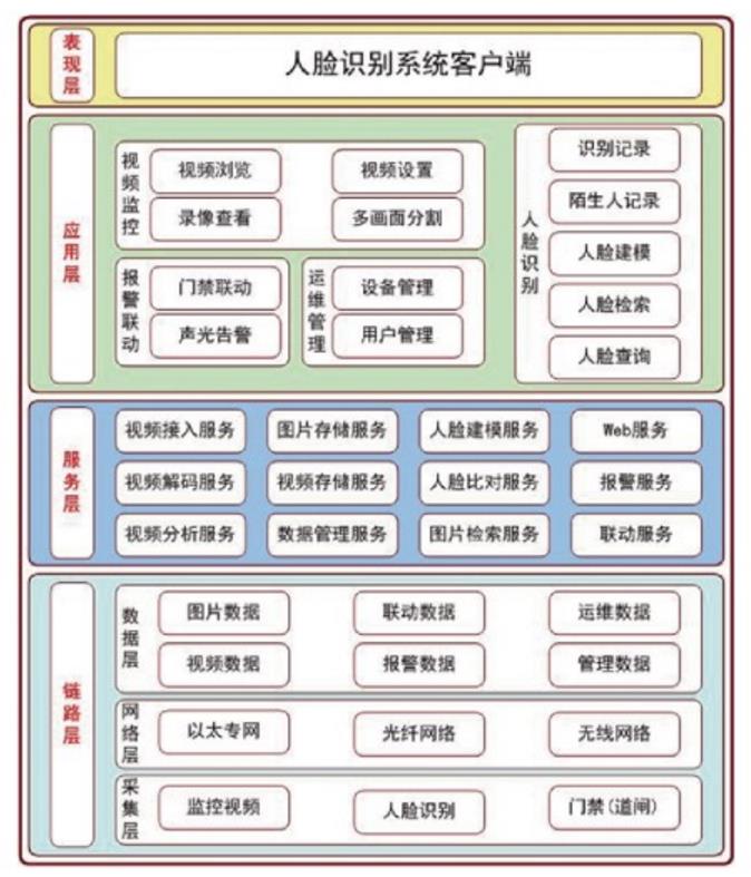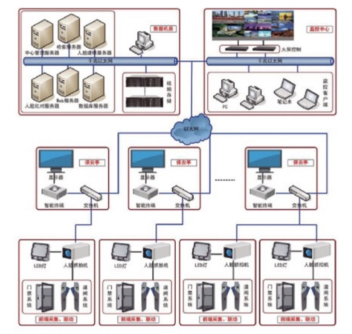 人脸识别物理架构由前端、保安亭、数据机房、监控中心四部分组成。